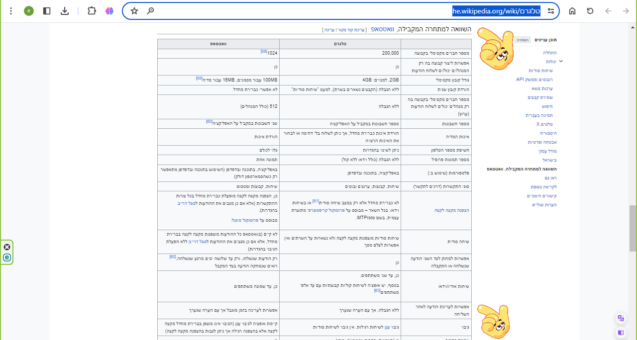קישור לטבלת השוואה בין ואטסאם לטלגם בויקיפדיה שם ניתן לראות כי טלגרם אינה מגבילה עריכת הודעות