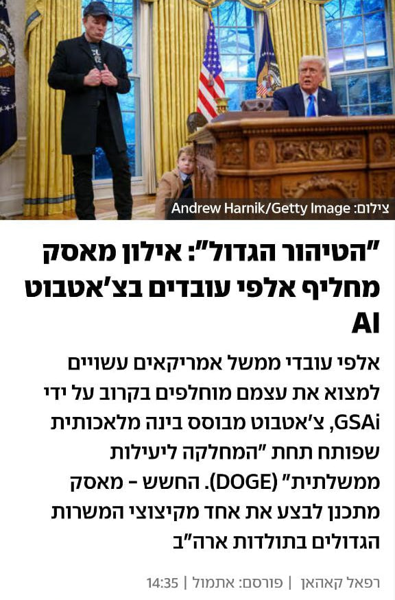 אלפי עובדי ממשל אמריקאים עשויים למצוא את עצמם מוחלפים בקרוב על ידי GSAi, צ'אטבוט מבוסס בינה מלאכותית שפותח תחת המחלקה ליעילות ממשלתית (DOGE). החשש - מאסק מתכנן לבצע את אחד מקיצוצי המשרות הגדולים בתולדות ארהב