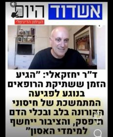 ד״ר יואב יחזקאלי, עוסק ברפואה פנימית במזה 40 שנה, מבקש סליחה ממטופליו ומדבר על הנזקים שלדעתו נגרמים כתוצאה מחיסוני הקורונה: ״על שדחפנו לחסן ילדים, וצעירים ובריאים, ללא כל צורך והצדקה… הגיע הזמן ששתיקת הרופאים בנוגע לפגיעה המתמשכת של חיסוני הקורונה בלב ובכלי הדם תיפסק, והציבור ייחשף למימדי האסון״