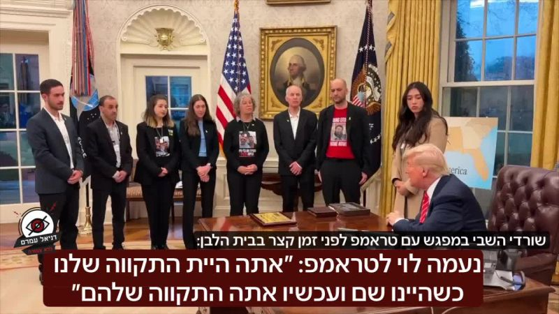 נעמה לוי לטראמפ: ״אתה היית התקווה שלנו כשהיינו שם ועכשיו אתה התקווה שלהם״: החטופים ששוחררו במפגש עם טראמפ: עומר שם טוב אמר: ״אני והמשפחה שלי מאמינים שאתה נשלחת בידי אלוהים לשחרר אותנו. יש לך את הכוח לעשות את זה״‏. ״אתה נתת לנו תקווה כשנבחרת וידענו שתעשה הכל. טראמפ השיב: ״אנחנו עובדים על זה קשה מאוד״.
